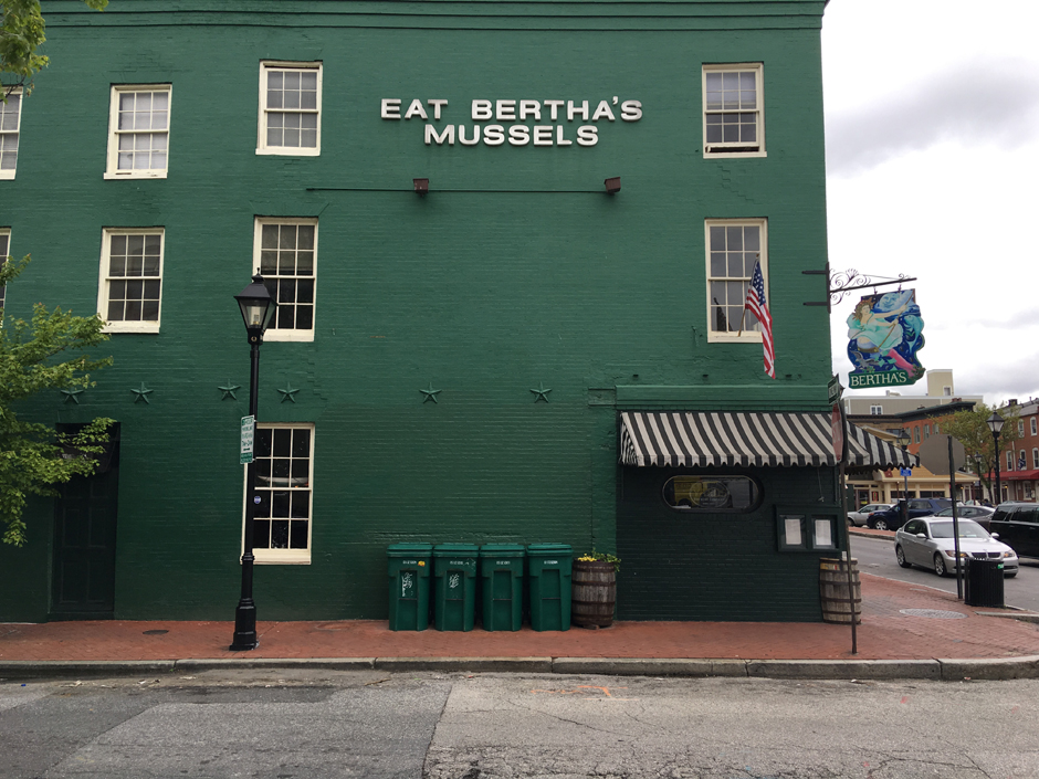 It cleared up a little so we went for a stroll. We noticed Bertha refurbished her sign! This is our third or fourth time in Fells Point but we still haven't sampled Bertha's Mussels; maybe next year.