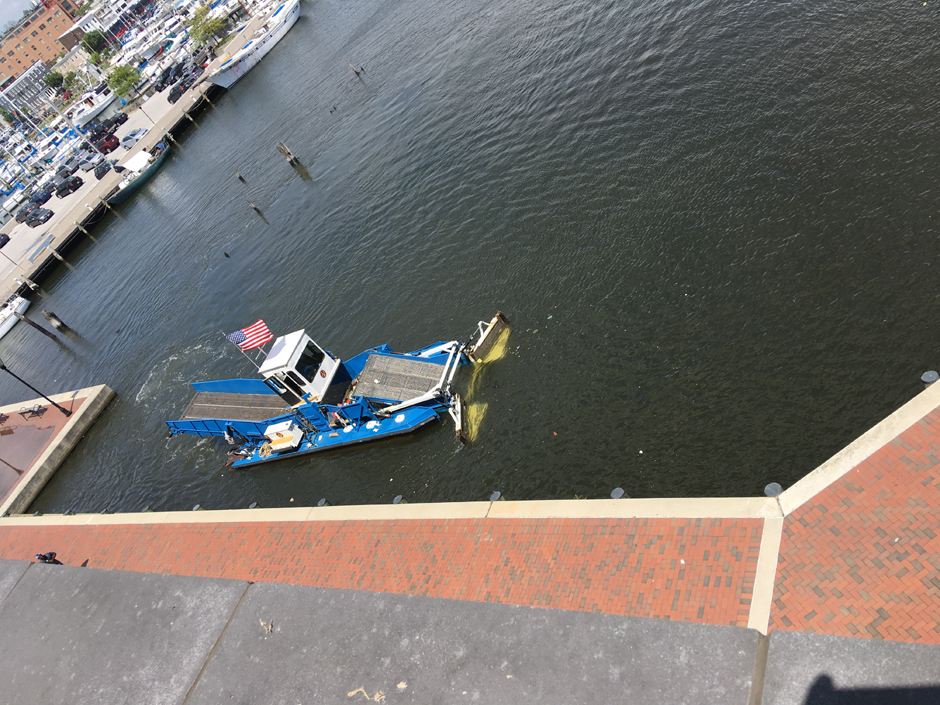 So this is looking down from our apartment at a boat that putts around and captures floating trash. It corrals it with the yellow arms and then the conveyor belt lifts it up and into the bin under the dog house.