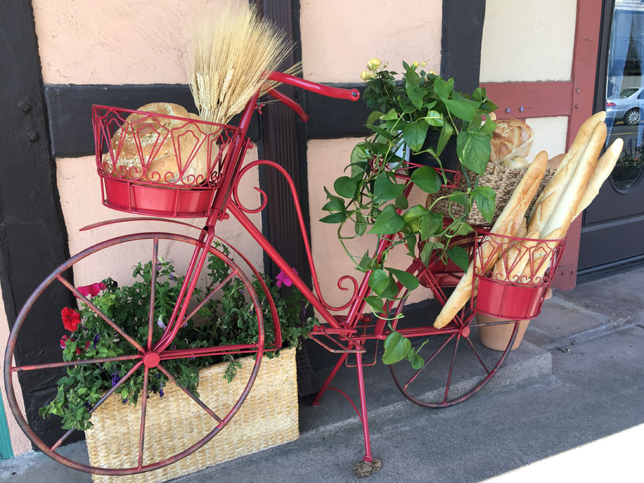 Here is a fake red Danish bicycle with bread and baguettes outside the bakery, which was not Danish, but had good baguettes!
