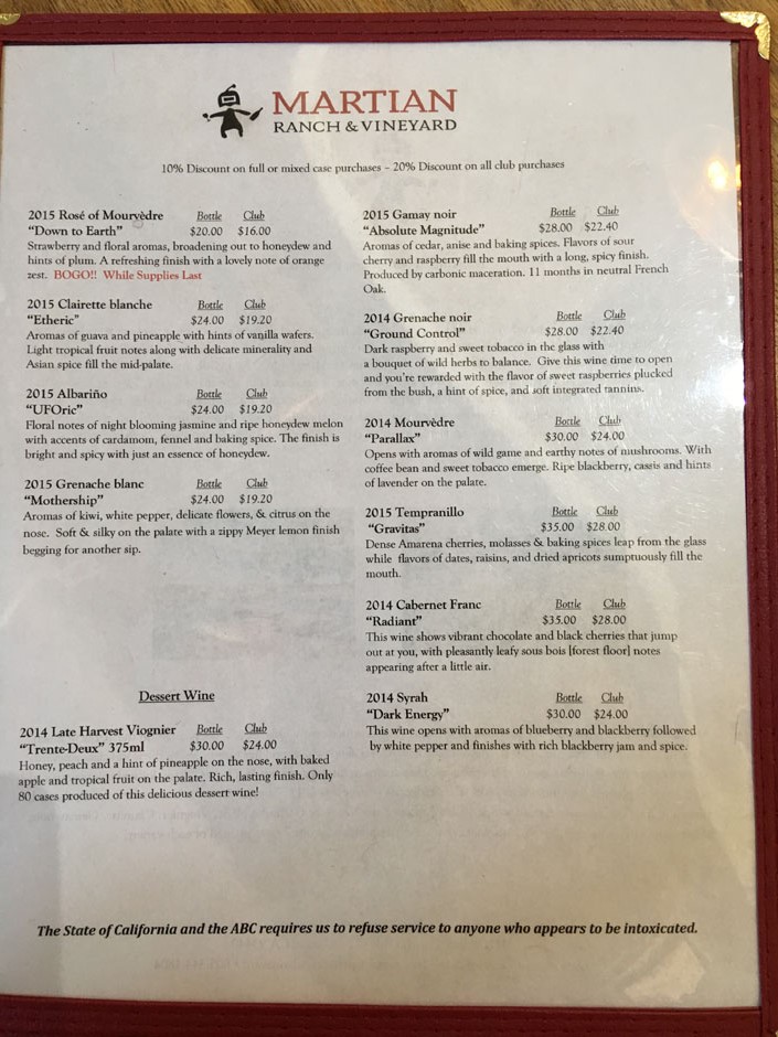 Well, not Mars the planet, but Martian Ranch and Vineyard, located off 101 on Los Alamos Canyon Road, a few miles north of Los Olivos. The Martian name actually is derived form the names of the owner's two sons, Martin and Ian, get it? I like the wine names.