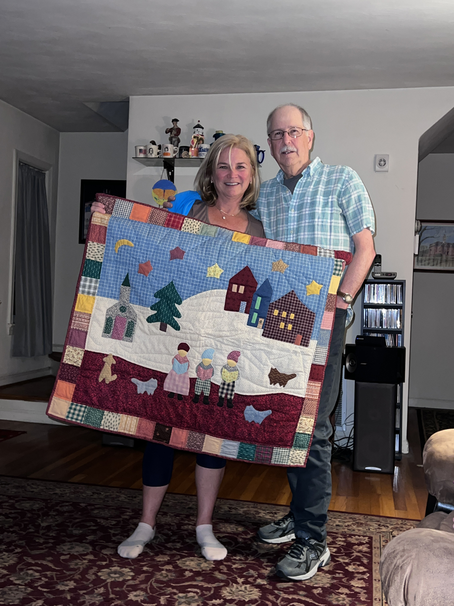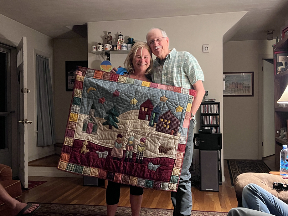 Here Bob is passing on a quilt, hand made by our mother, to Debbie, who, as you can see was deeply moved.