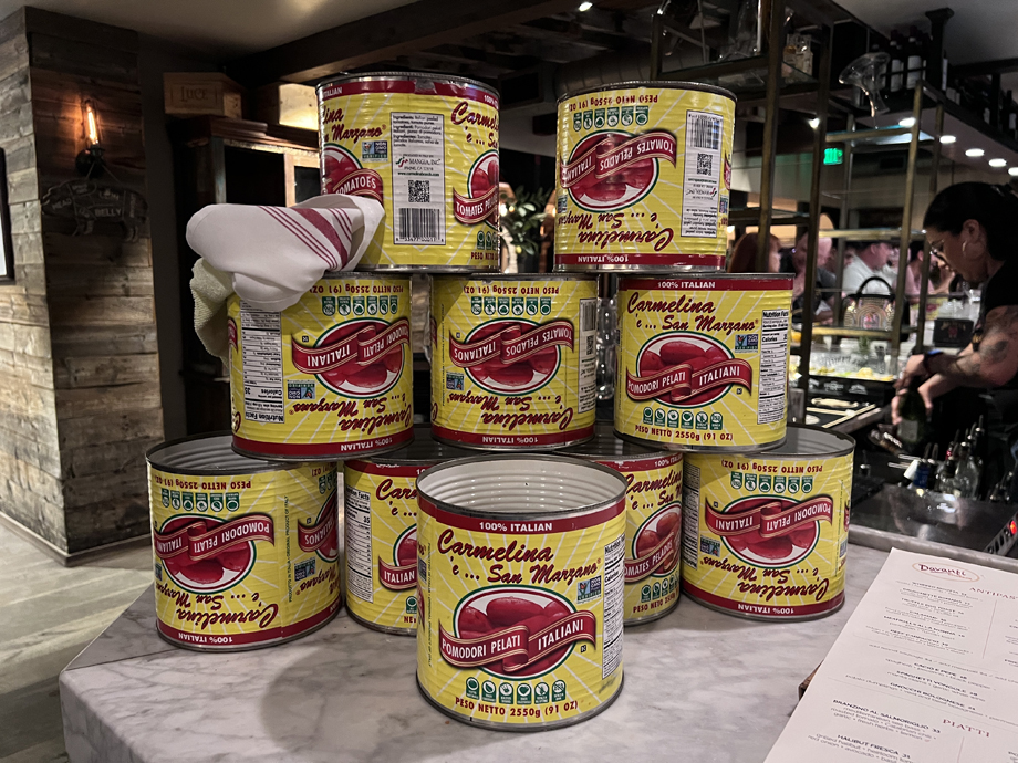 They use these empty tomato cans as stands for pizza when they bring it to your table