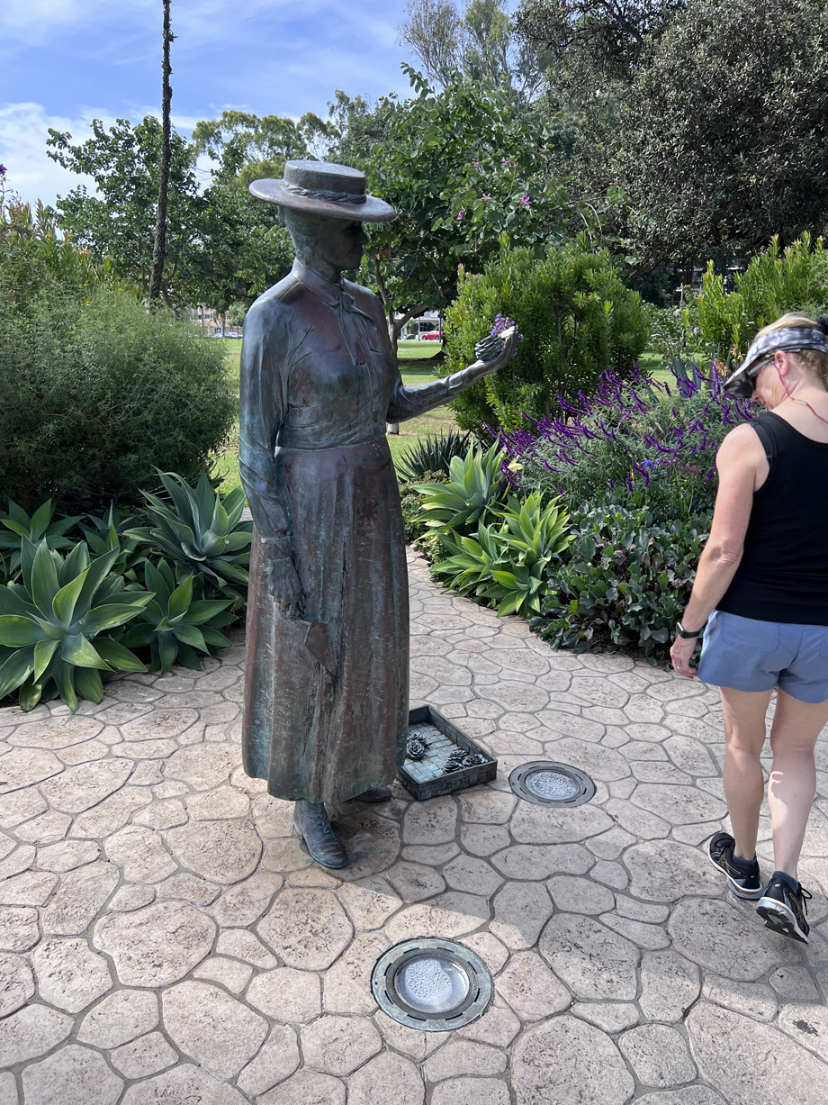 We decided, after consulting Google Maps, to walk up the hill to Balboa Park. It was yet another beautiful San Diego day. So we went from Cedar to 1st St to Fir to the Park itself and soon came upon? Kate Sessions? Helen B Scripps? Mrs., Green Jeans? IDK.