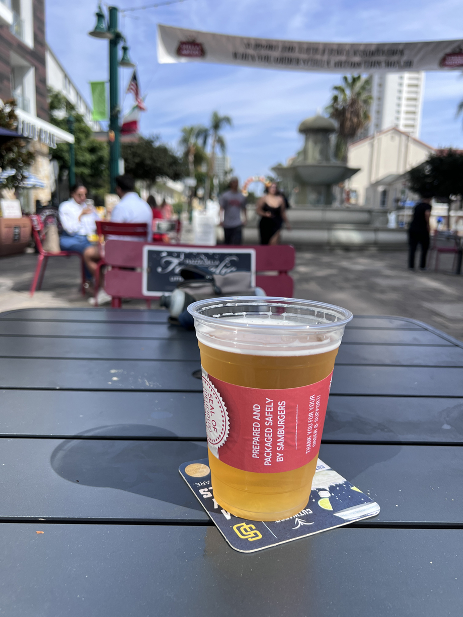 Stopping only for a safely packaged beer by Samburgers at the Piazza.