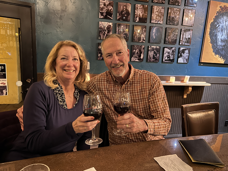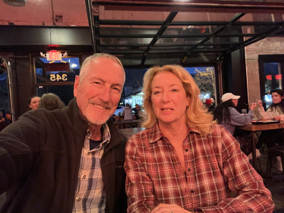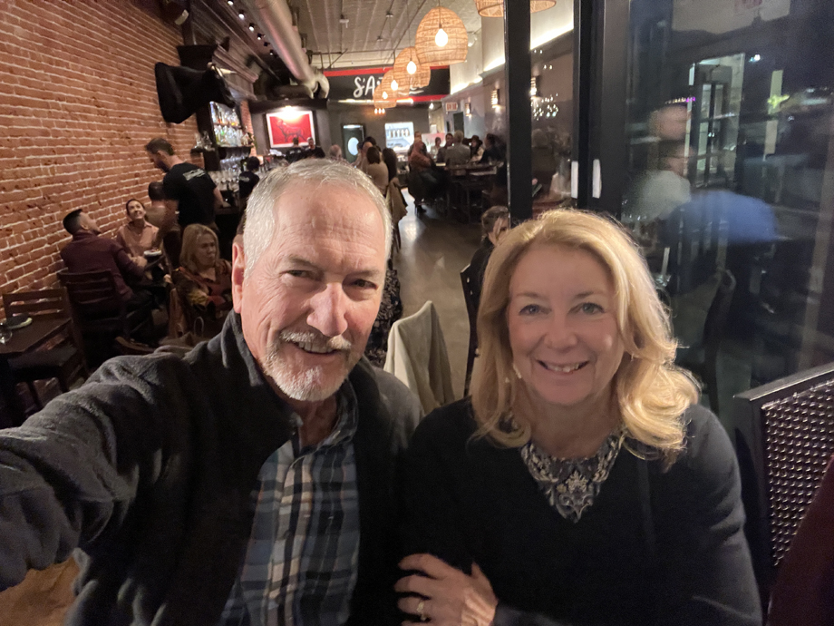 Selfie at S'Aranella from our seats looking out toward the town square with our backs to the restaurant.