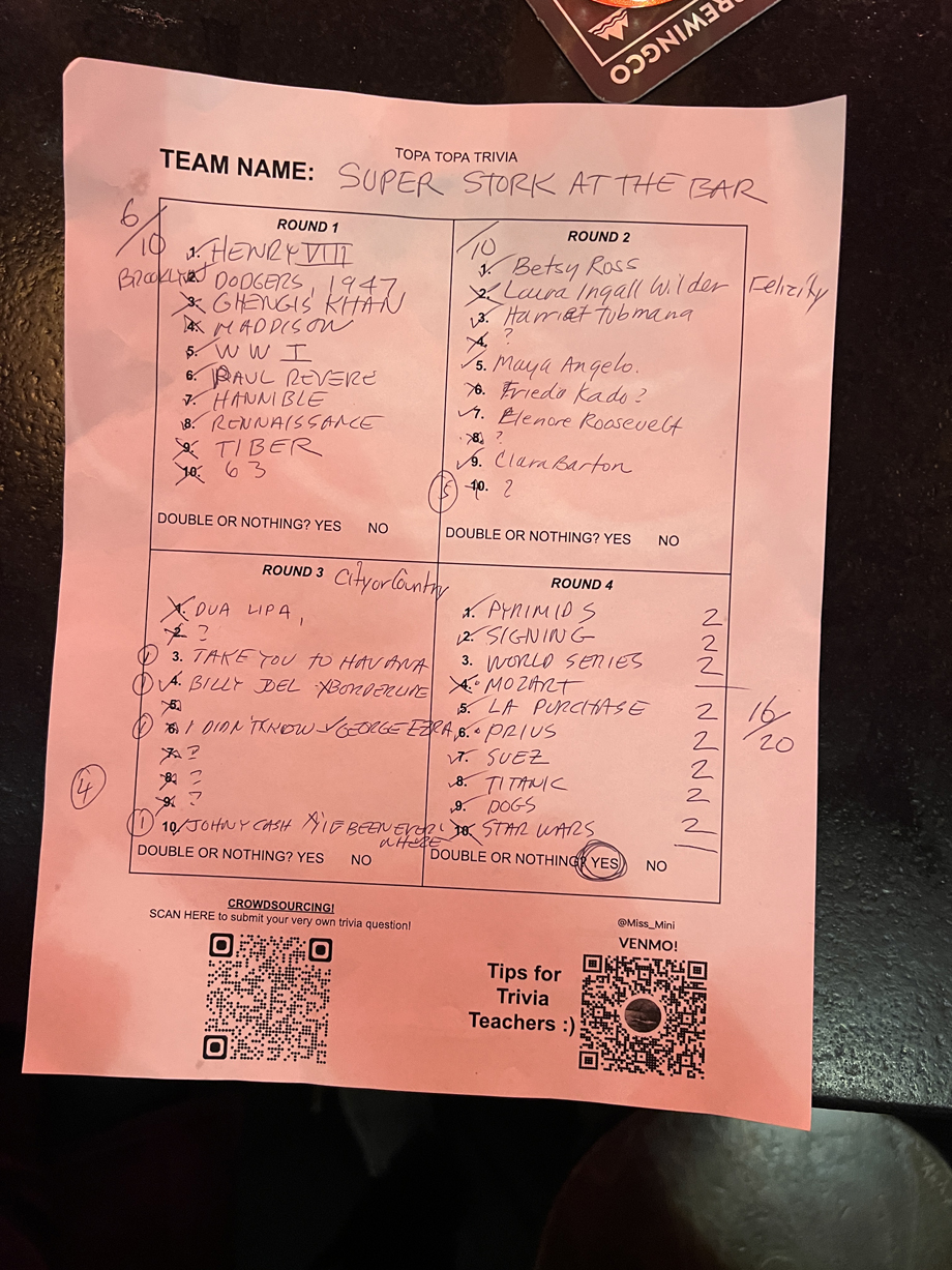 Our trivia results? Not so much. Did OK on history and "what happened first?", though