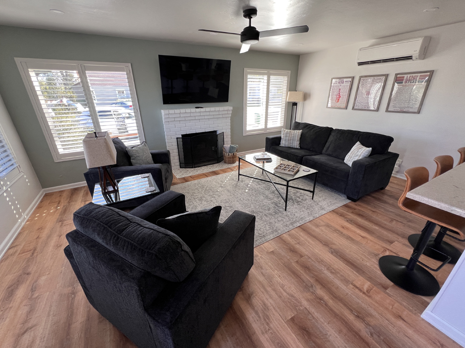 The sitting area and electric fireplace