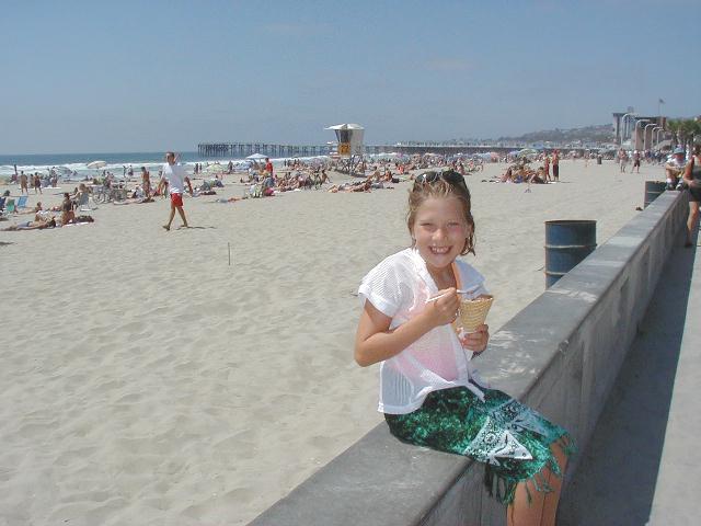 Me eating a "Not So Big Olaf" two-scoop ice cream cone on the wall by the beach. A "World Famous Olaf" has four scoops.