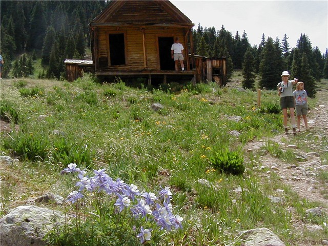 Mine ruins at Eureka; Lorri in the "bay window" in one of the old buildings at Animas Forks.