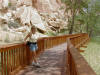 There was a very nice shady walkway along the petroglyph cliff. The little petroglyph guy in the center of the photo on the right is used as the logo for the park.