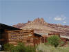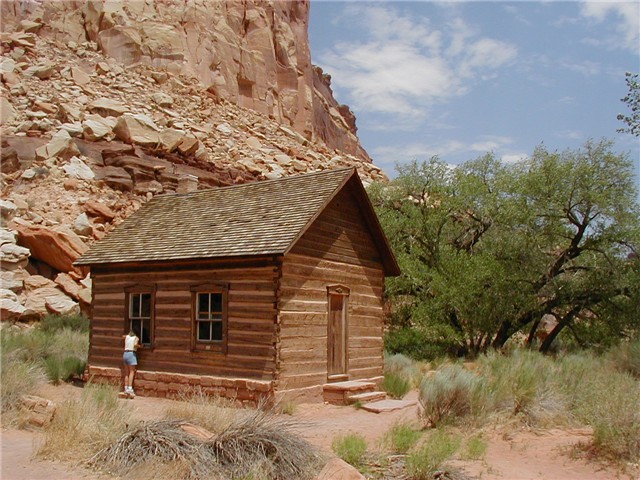 The Fruita School house on the left was in use until 1941. On the right is a view of Cathedral Rock over the Visitor Center.