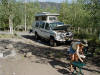 Fortunately we had a second spare, the factory spare stored underneath the back of the van. I figured no big deal, I'll just pop it up on the high-lift jack, throw on the spare and then buy a couple new tires in Cedar City. Well, once I got the right tire off the ground, the van started slipping sideways! This was not a good thing. I put the old tire back on before the van tipped over on me and watched as the jack slowly settled into the asphalt at an angle against the rear door that made it impossible to jack it up or down. I'm thinking of stating a clinic on how not to change tires. We were stuck! I was on hold with AAA when a kindly Highway Patrolman showed up and called the local AAA tow service for us. They lifted the whole back of the van with the hydraulic lift on the back of their truck and we put on the factory spare and limped into Cedar City.