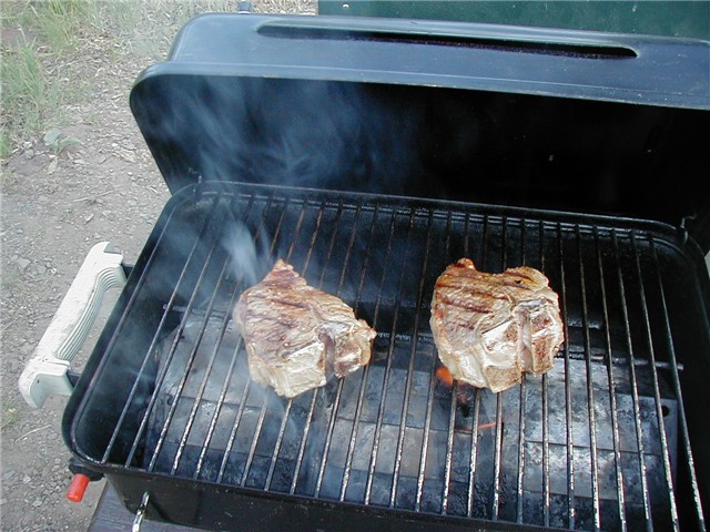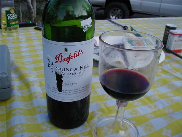 We eat well when we camp. On the left are our lamb chops smoking on the barbie. In the middle is the evening's wine selection and on the right is our dining table.