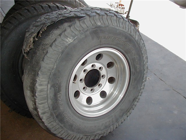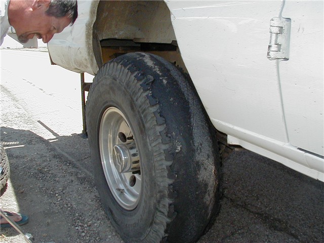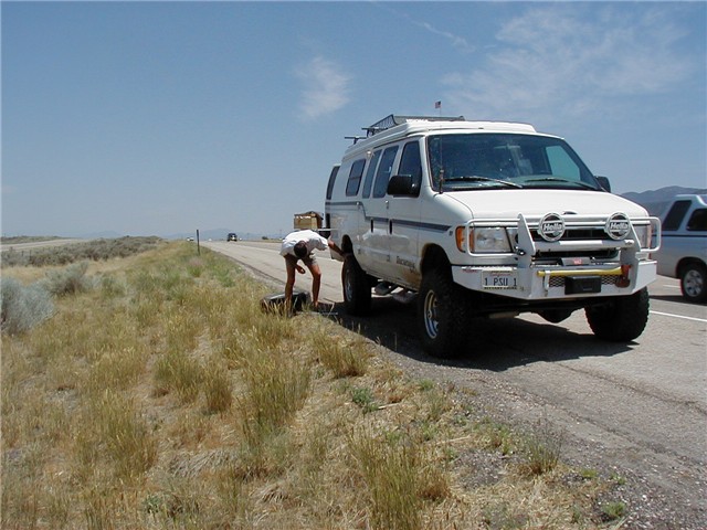 Alas! About 8 miles north of Cedar City, Utah, the tread flew off our passenger side rear tire! Lorri was driving and expertly pulled off to the shoulder. The tire still had air in it but most of the tread was lying back on the highway after it beat the heck out of the side of the van and the tail pipe.
