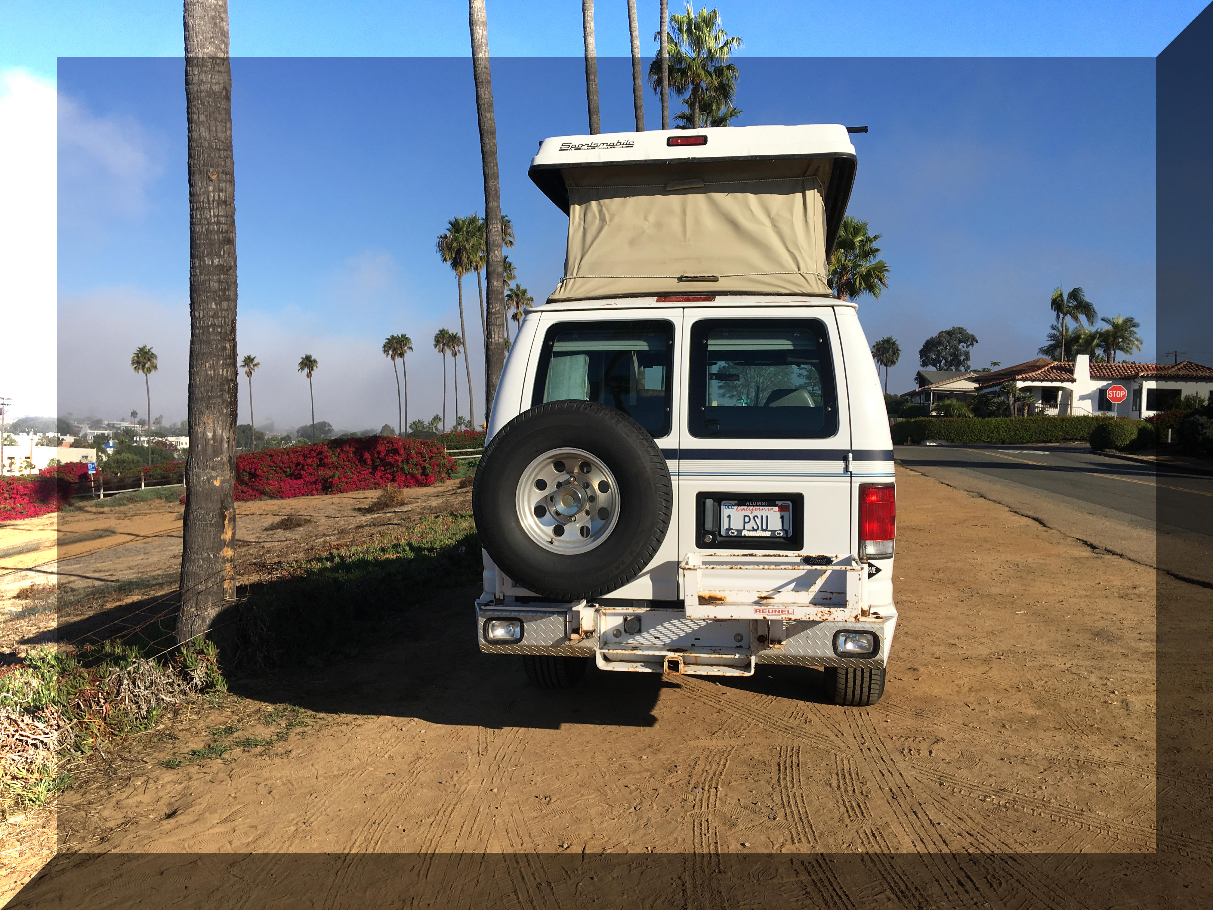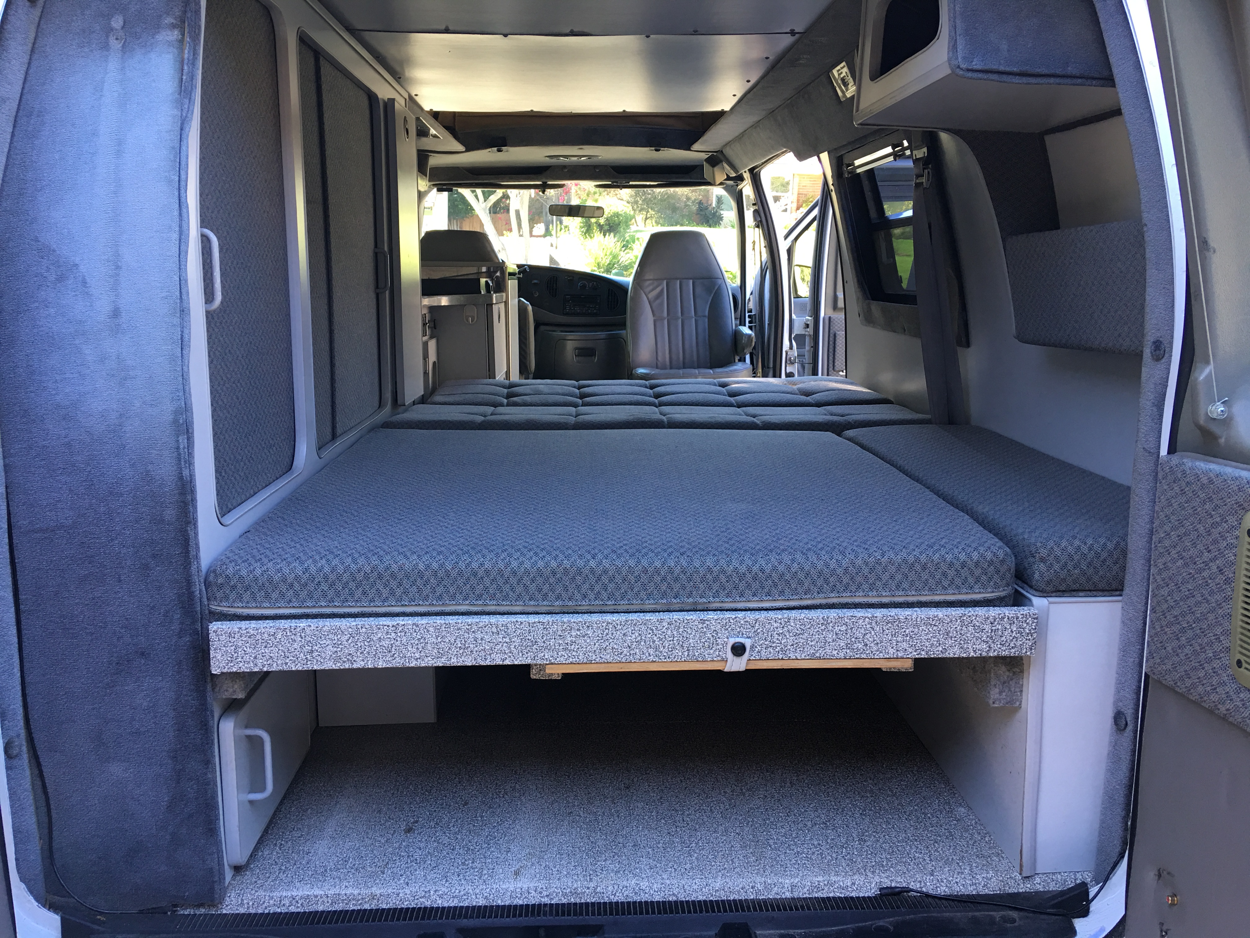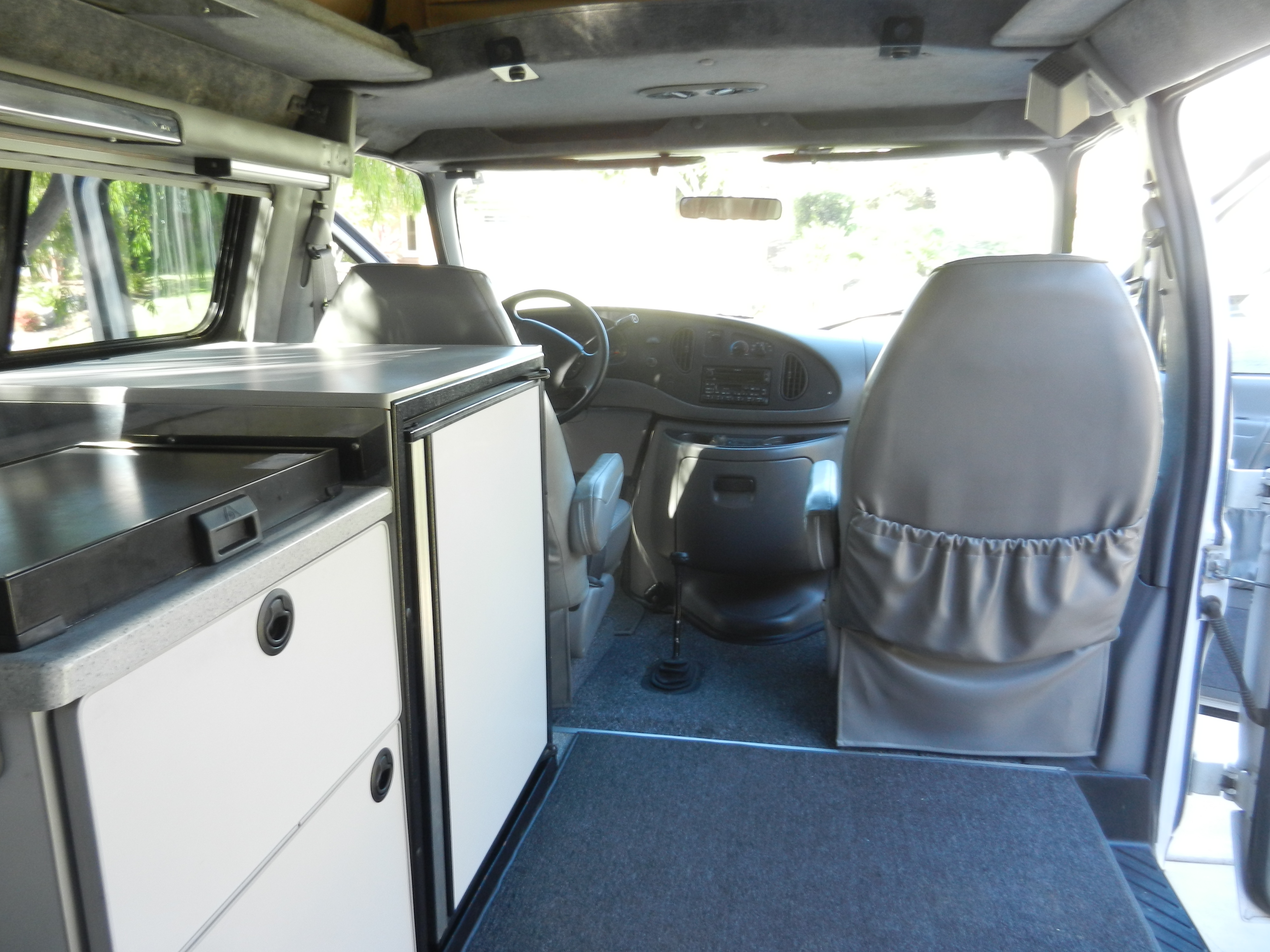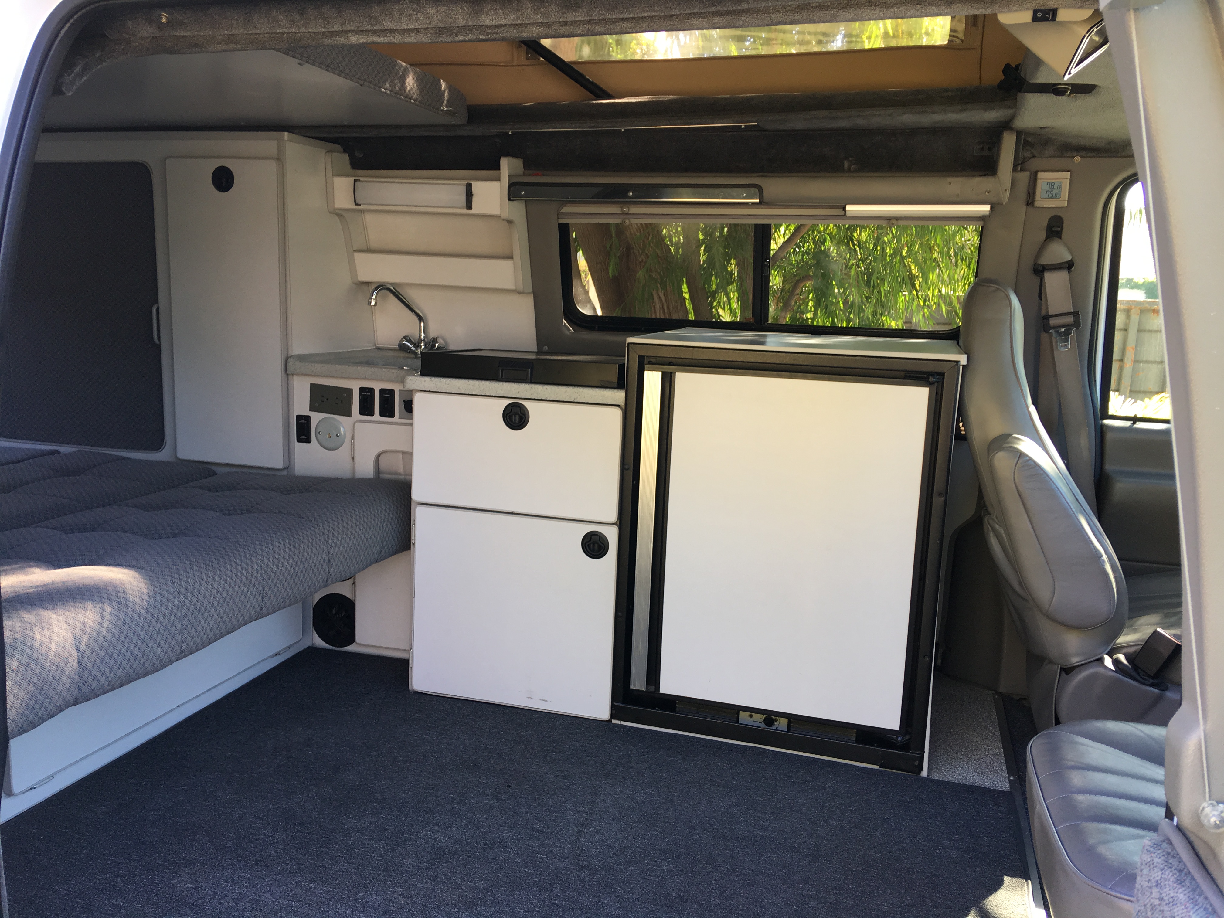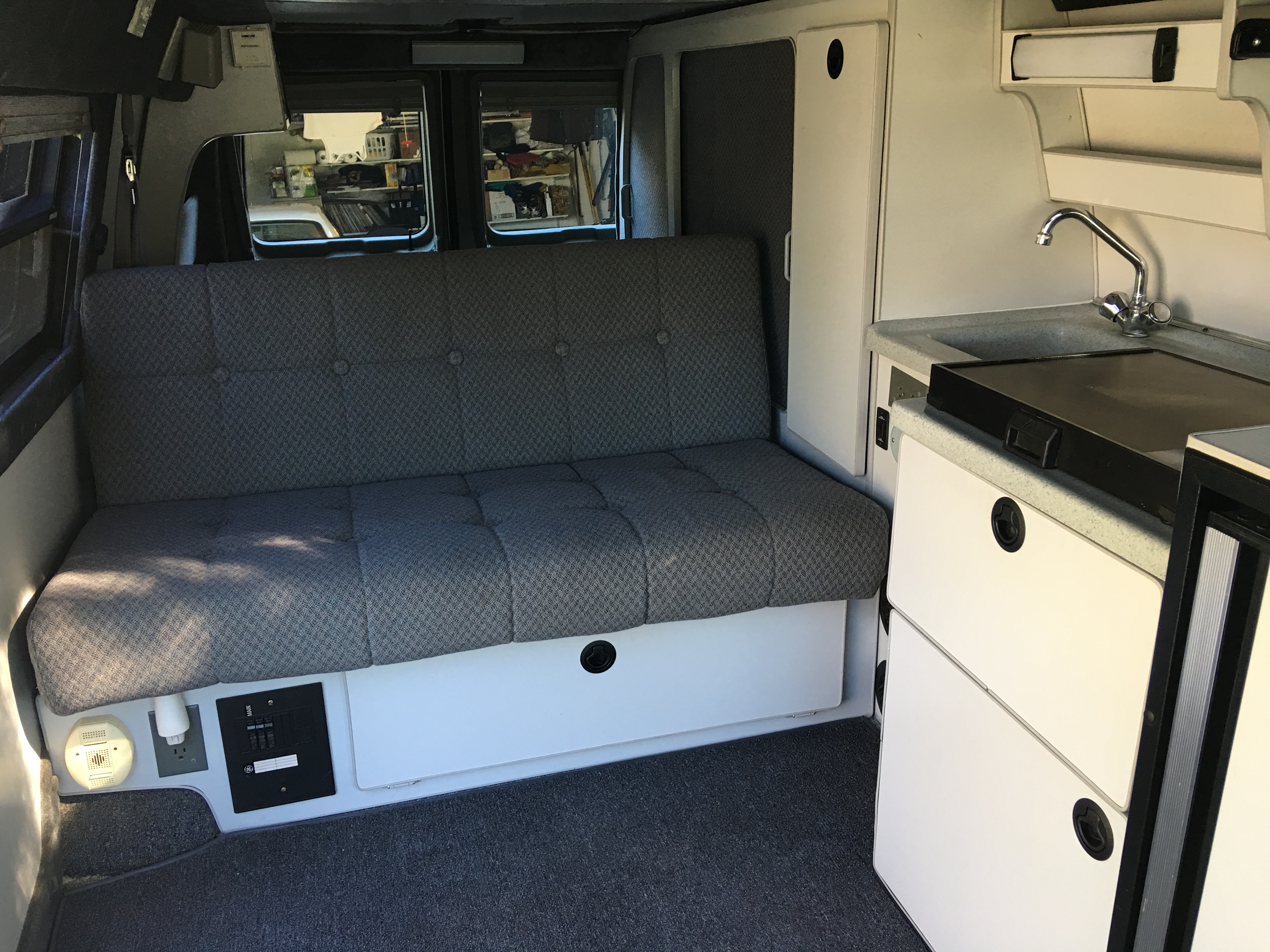 10 gallon fresh water and grey water holding tank, two-burner propane stove, and propane furnace for heating.