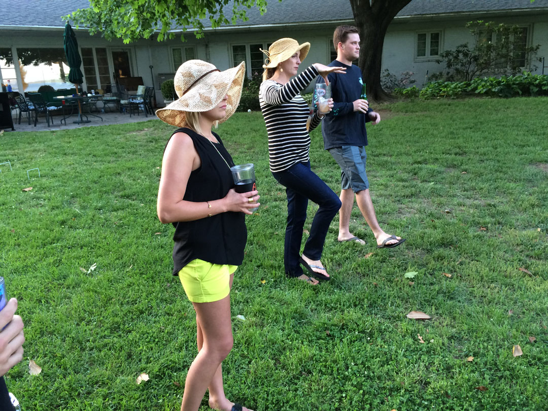 Sarah pointing out the finer points of "farm" croquet to Mal and Colin
