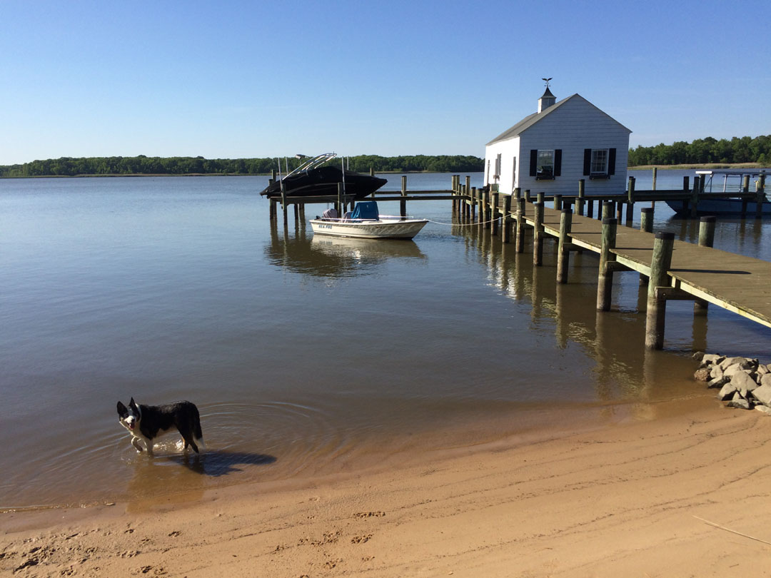 The boat house, beach, pier and the dog
