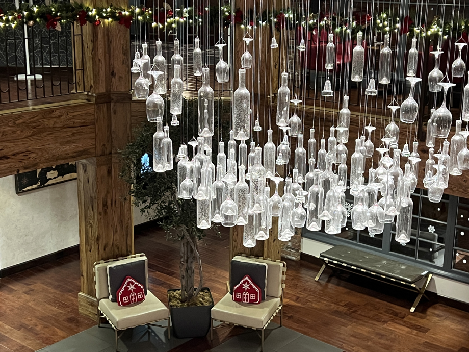 The chandelier at the Corque hotel. Very apropos for wine country! Although there are lots of bottles but no Corques!