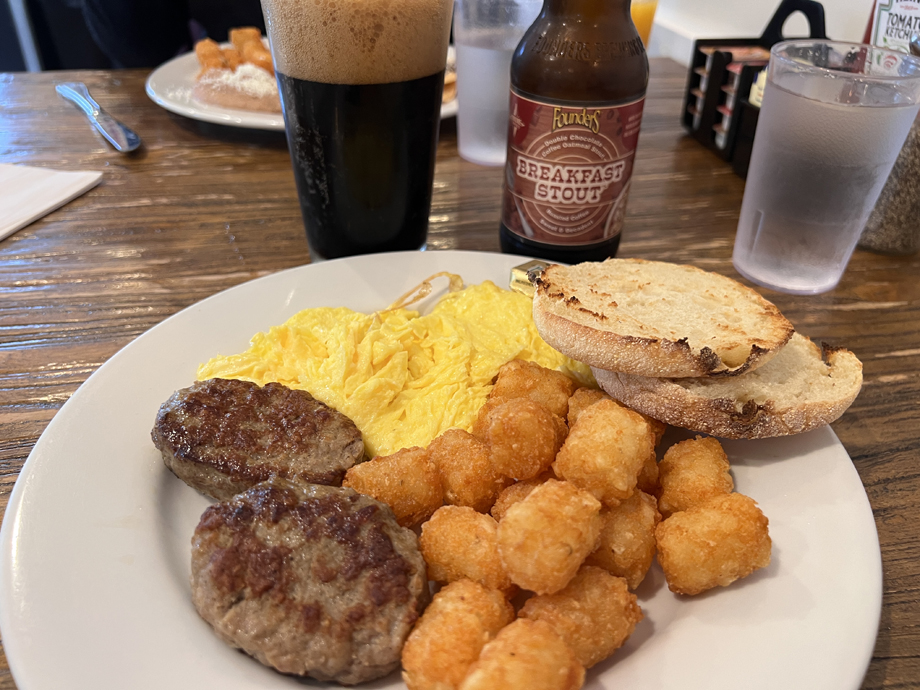 This was my brekkie! Crispy tots, sausage, eggs, English muffin, and of course, a breakfast stout! Added plenty of ketchup to everything after the photo, except the stout, of course.