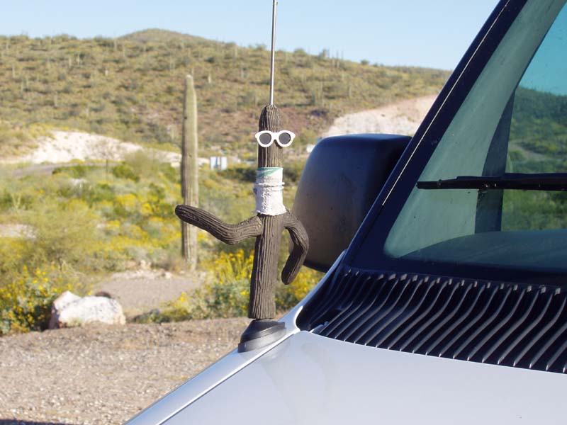 This is Pecos Pete. He's been our leader and guide since the first day of our first Road Trip, nearly five years ago. He has lost his hat (somewhere in Texas), his left arm is nearly severed and his diet of smashed bugs, windshield washer fluid, and rain water has taken it's toll over the years, We're afraid he won't last much longer.
